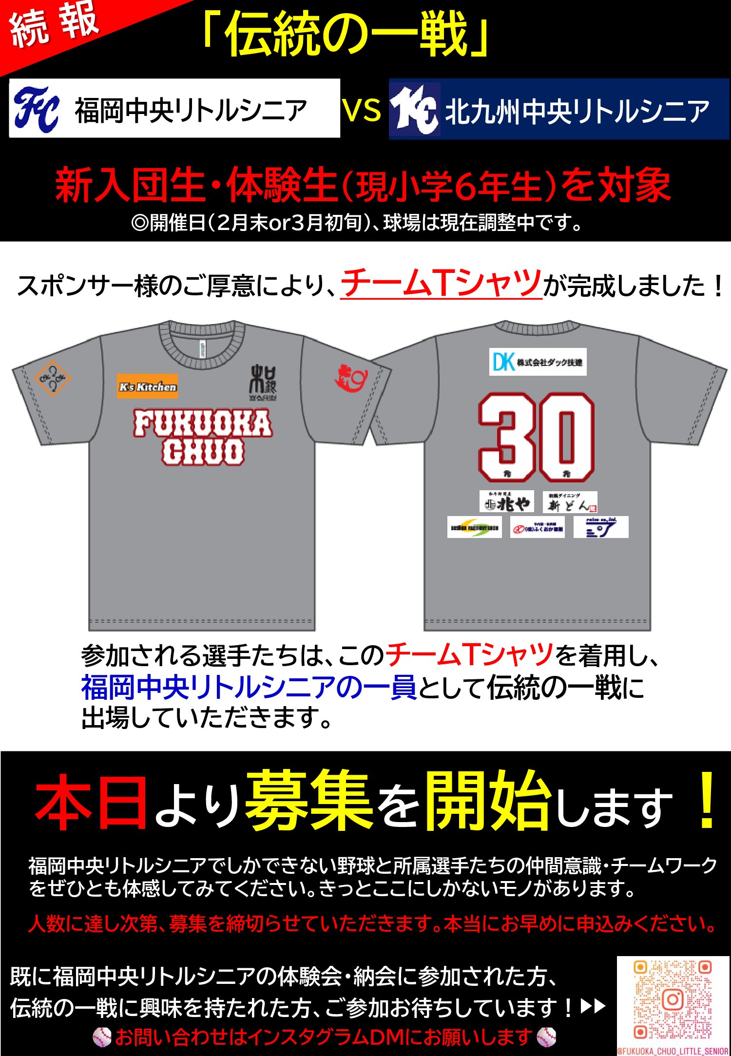 興味のある方は、随時体験練習会を行っておりますので、 福岡中央シニアの選手たちや指導方針、雰囲気を感じてみてください。 一緒に野球をしましょう。 多くの皆様方のご参加をお待ちしております。